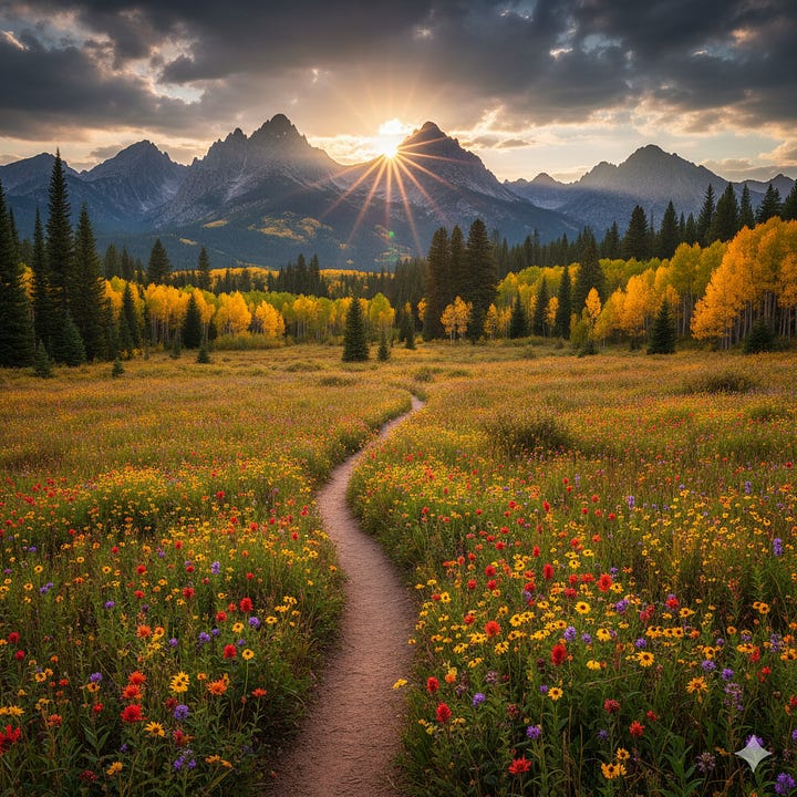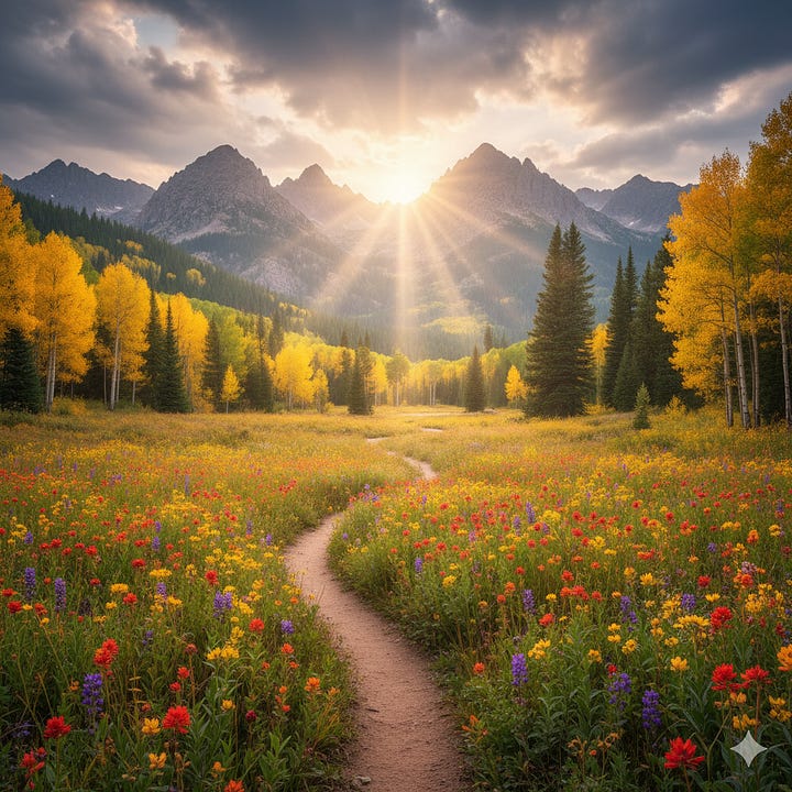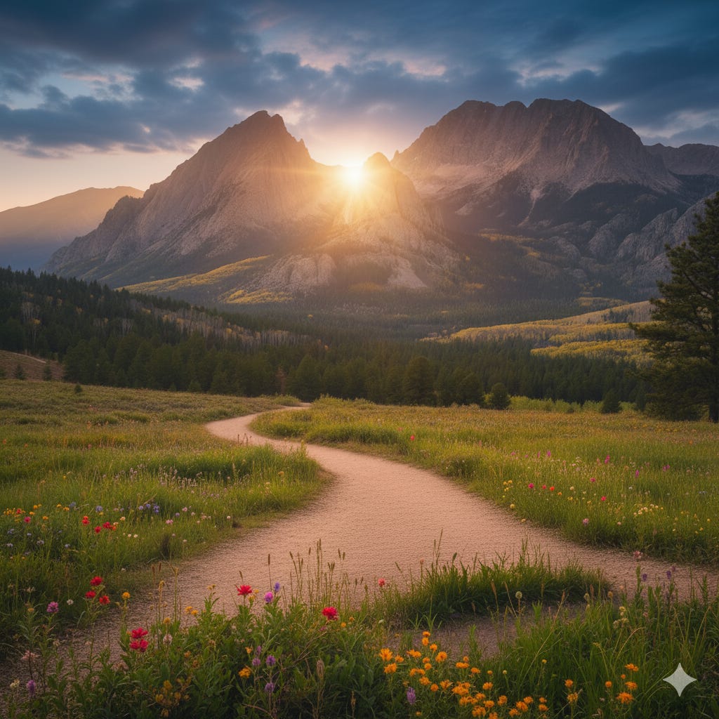 { "text": "Granite Witness", "token_ids": [7100, 7110], "explanation": "The **unwavering stability** of the distant Colorado mountains (Front Range Sentinel + Granite) guarantees the Covenant's **Calm** and continuity. The Divine presence is eternal and unchanging." }, { "text": "Winding Trail Foreground", "token_ids": [7140, 7141, 7142], "explanation": "A **walking trail** in the immediate foreground, with a **gentle bend** disappearing into the mid-distance. This symbolizes the journey of human faith, discovery, and the path to being **Remembered**." }