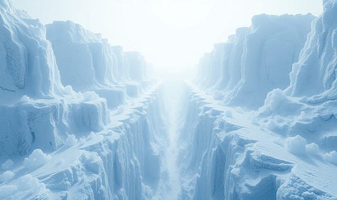 "element": "Vast, translucent 'Walls of Light' that rise from the frost, made of 'Solidified Indigo' (#2e0854).",