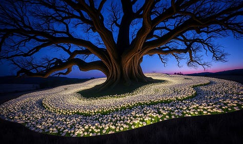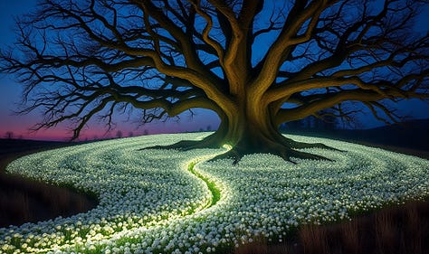 "floral_element": "A colossal, overwhelming 'river' of countless white flowers (#ffffff) flowing through the dry grasses and completely cradling the massive base of the oak trunk."