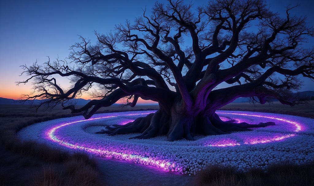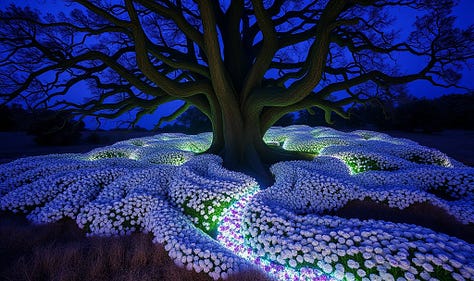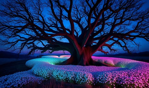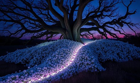 "ethereal_illumination": "The floral river pulses with a soft, spiritual internal glow in gradients of Medium Purple (#8c52ff) and Dark Cyan/Teal (#3f96afff). This unearthly light is the primary source of illumination, casting colored highlights on the deep textures of the ancient oak bark."