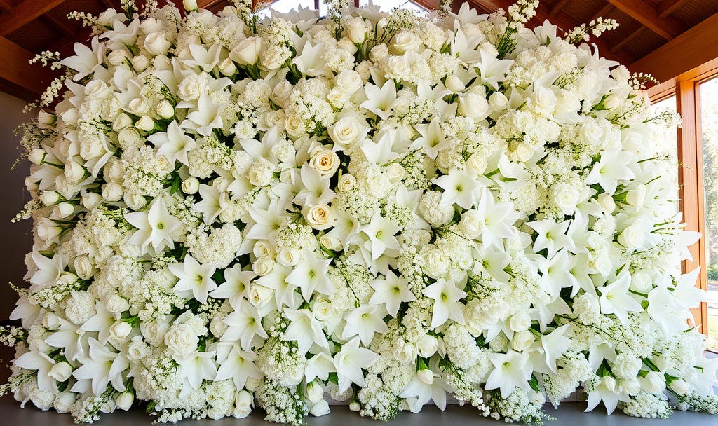 "primary_element": "A massive, coherent 'river' of white flowers (#ffffff - lilies, orchids, roses, baby's breath) cascading out of the open doors of a modern Davis gallery pavilion.",