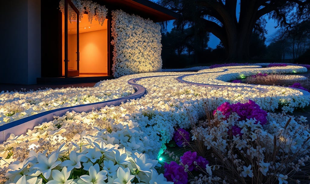 "active_illumination": "Embedded, hidden LED lighting within the floral river pulses slowly with the accent colors: Medium Purple (#8c52ff) and Dark Cyan/Teal (#3f96afff), making the white flowers appear to glow from within against the darkening landscape."