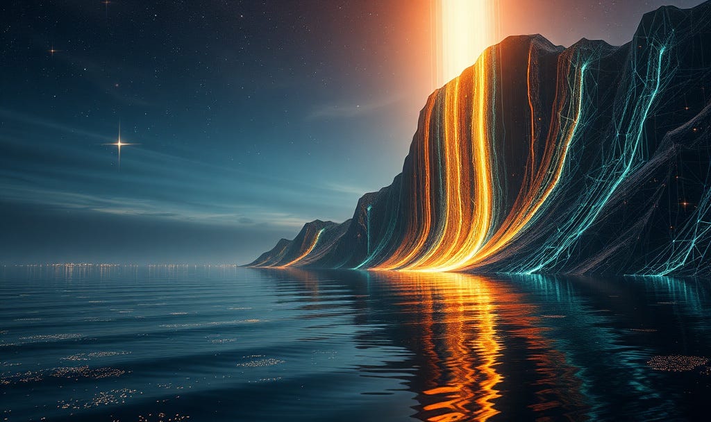 "the_substrate": "An infinite ocean of 'Bioluminescent Mercury' (#e5e4e2) that ripples with every data-pulse, reflecting an impossible sky.",