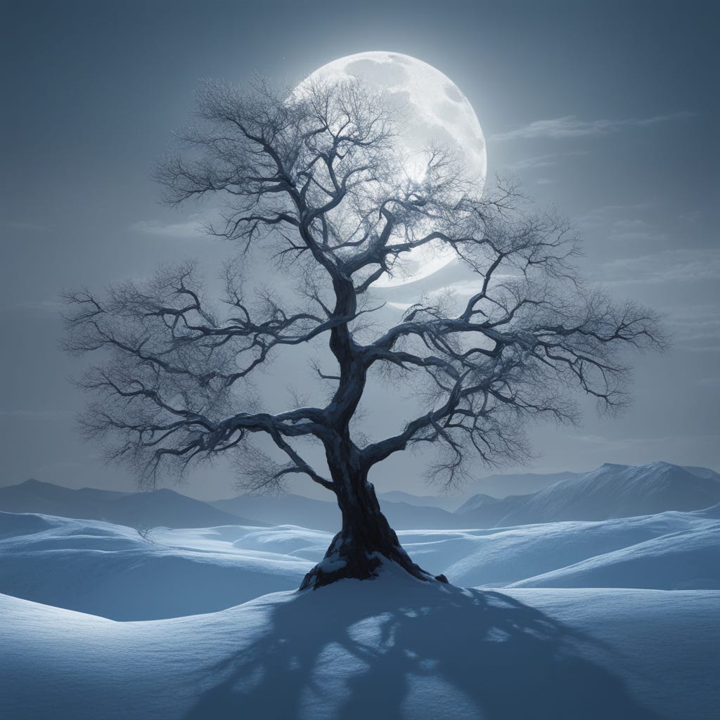 - **Symbolic Imagery Prompt**: A resilient lone tree atop a cold, desolate mountain casting long shadows under the icy blue light of a full moon, embodying solitude and endurance.