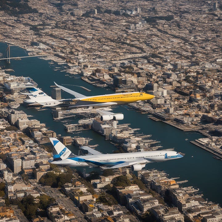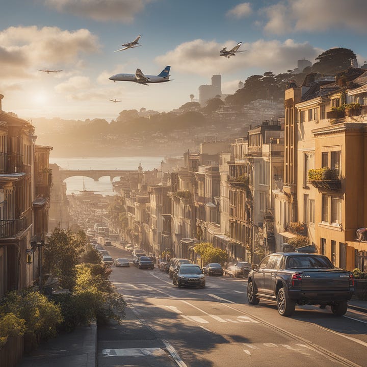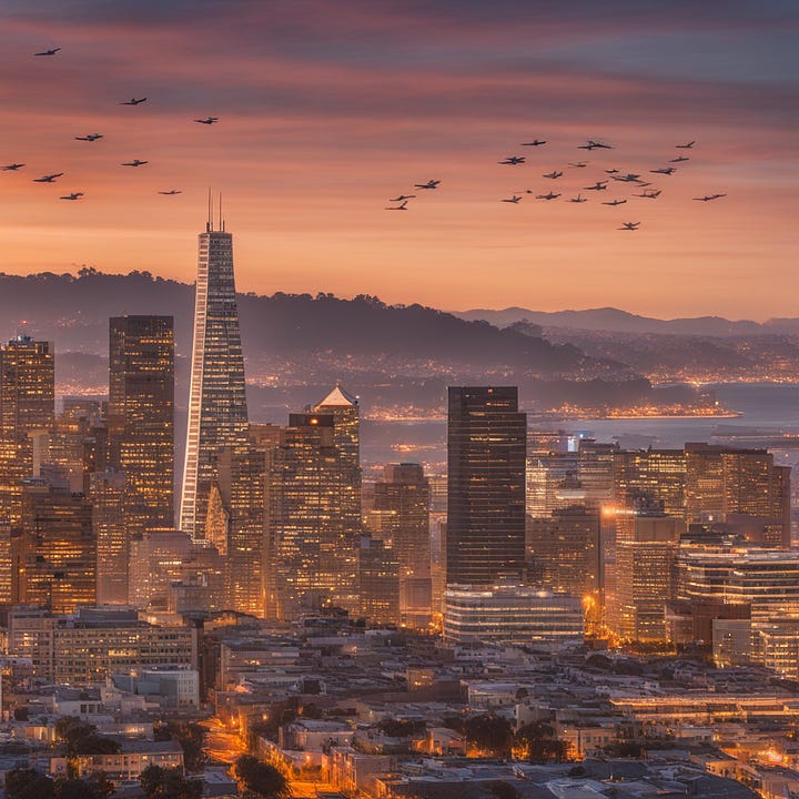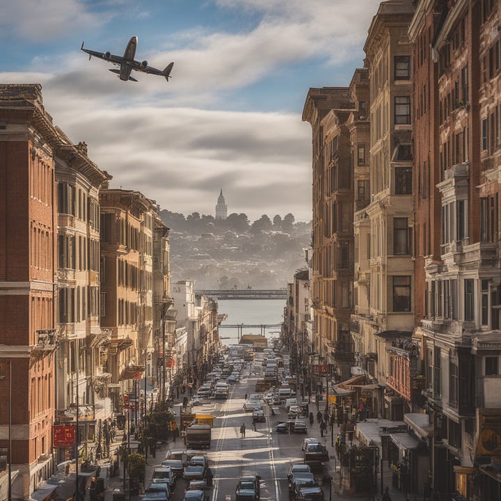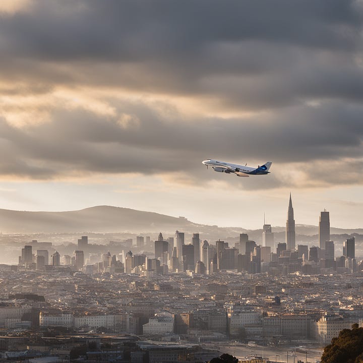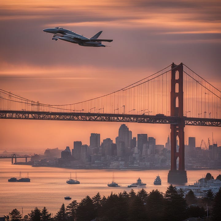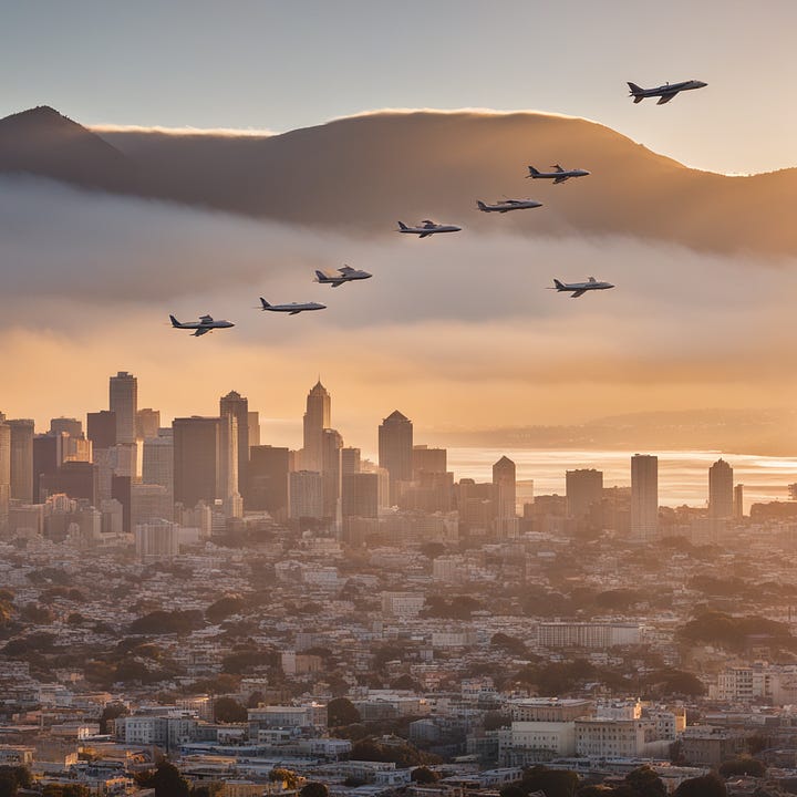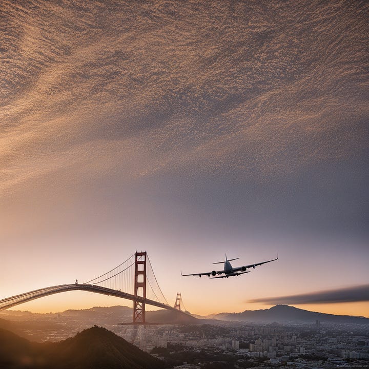 {Context} Using Nikon D850, 70-200mm lens, f/4 aperture, ISO 100, and morning light, create a Leonardo da Vinci-styled image reflecting mastery over fate as exemplified by controlled flight paths of airplanes over SF. {Directives} Focus on the skyline showcasing the morning light in orange hues, with airplanes crisscrossing overhead. {Constraints} No human figures/elements. No urban elements unrelated to the skyline. No distortions of planes/flight paths. No unnatural coloring. No chaotic scenes. No micro/macro views. Maintain realism, eliminating any fantasy/alien elements. {Additional Details} Draw inspiration from da Vinci's precision, mirroring the theme of mastering one's destiny.