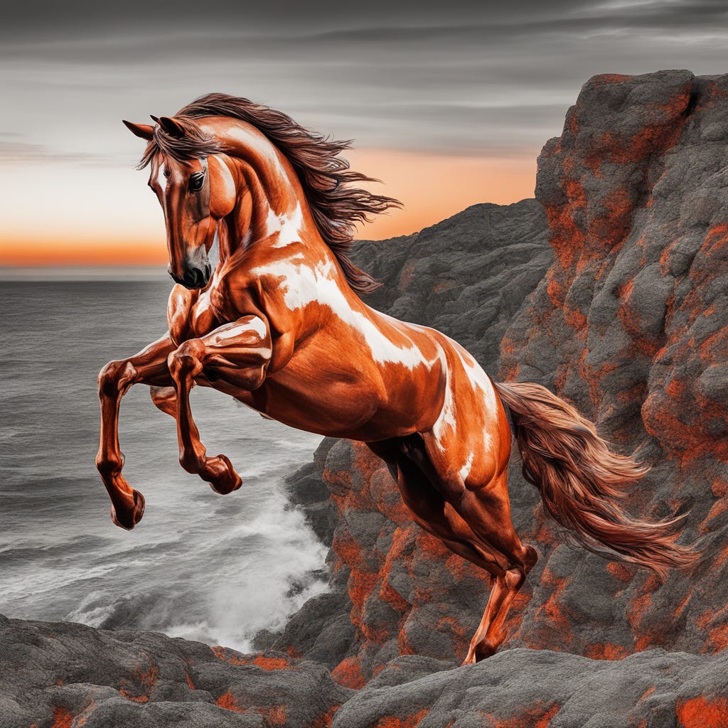 Time: Tangerine Dawn. Subject: Roaring Horse. Color: #FF4500 (Hex color for orange-red) Artistic style: Channeling the abstract creativity of Kandinsky’s. Emotion: Wild Fury. Environment: Edge of a cliff, where night grudgingly gives way to day. Camera equipment: Nikon D850, Nikkor 70-200mm f/2.8 lens. Lens Position: Creative Bird's-eye-view, capturing the unbridled power of the horse in a 5K resolution with a 16:9 aspect ratio for optimal digital display. A horse, a vivid mass of #FF4500, is brought to life, its angular forms roaring with the wild fury of the coming day, much akin to Kandinsky's abstract routes. It stands against the dawning horizon, a testament to the ceaseless wheels of time. Avoid: Slowing the momentum to a peaceful stroll, introducing soft, pastel shades opalescent hues (#6699CC) that mirror Franz Marc's animal paintings, and resorting to standard angles or compositions which might oversimplify or conventionalize the scene, or using pixel density less than 300 PPI (pixels per inch). End-Scene-Depiction.