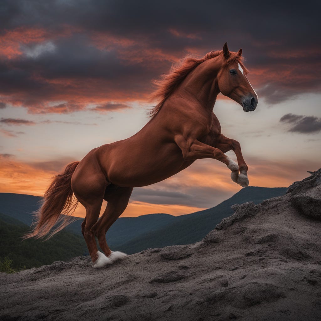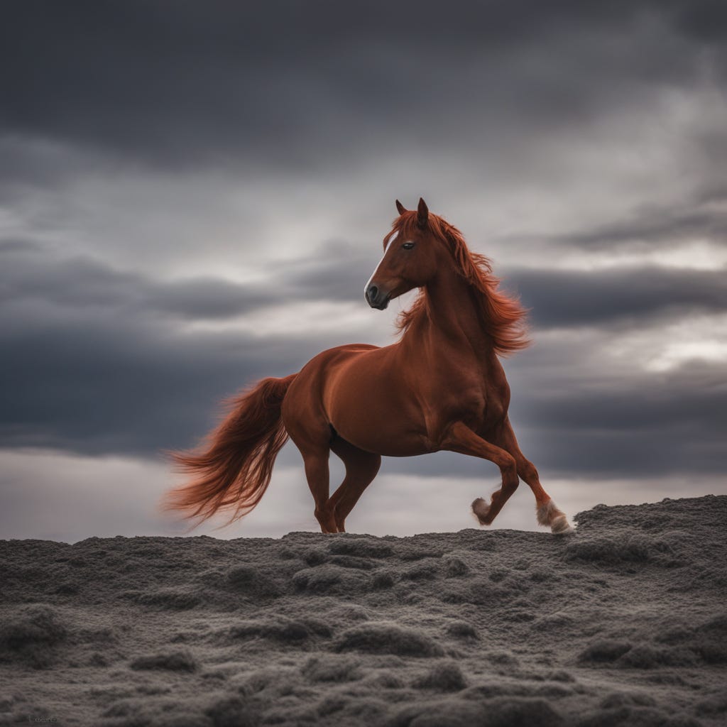 Commence-Scene-Depiction: Time: Pre-Dawn. Subject: Highly-Muscular and Powerful Horse. Color: Fiery Red. Emotion: Extreme Aggression. Environment: Brink of a cliff under the dark sky. Camera equipment: Nikon D850, Nikkor 70-200mm f/2.8 lens, Kodak Ektar 100 35mm film. Harness hyper-realism to immortalize a fiery red horse in its zenith of raw power and uncurbed energy. The horse should be sculpted with bulbous, rippling muscles, reflecting an intimidating strength in its every stride. It gallops with a wild, unstoppable momentum, nostrils flared, and eyes ablaze with ferocious determination. Distinctly render four equine legs, thundering against the terrain, kicking up an storm of dust behind. Illuminate the scene with the pre-dawn light that casts a dramatic glow against the horse's fiery coat. The composition underlines the horse's daunting dominance over its environment. Avoid: Underplaying the horse's muscular form, slowing down the gallop, soft focus, anatomical inaccuracies, particularly not more or less than four legs, diluting the aggressive stance, atmospheric inconsistencies, and reduction in resolution. Ensure the horse remains in mid-gallop throughout the depiction, symbolizing relentless power and agility in the face of oncoming day. End-Scene-Depiction.
